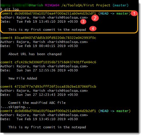 As you can see not only the commit history with the commit identifier is shown. These commits are shown in reverse chronological order (the last commit will be shown on the top). It also includes various other information which is extremely useful since the Git repository is not used by a single person. A Git repository is also accessed and used by many remotely. This running log of commits contains the following four pieces of information: