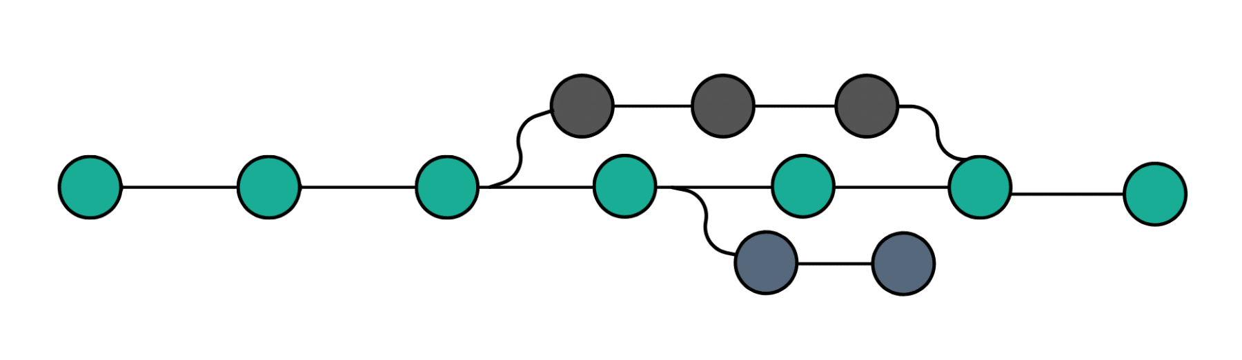 The creation of the top branch happened upon completion of three commits in the master branch (the green circles). The same goes for the bottom branch, whose creation took place after four commits performed. Now let's see the same image with every branch removed but the top branch.