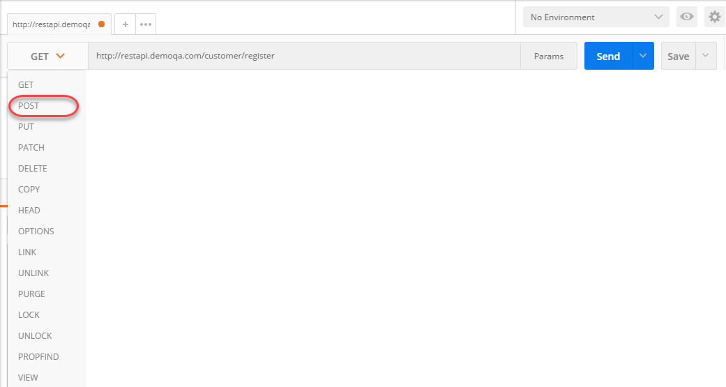 - Use the API http://restapi.demoqa.com/customer/register (This API is used for registering a new customer) in the Postman endpoint bar and press Send. Make sure that GET is selected in the Method type dropdown.