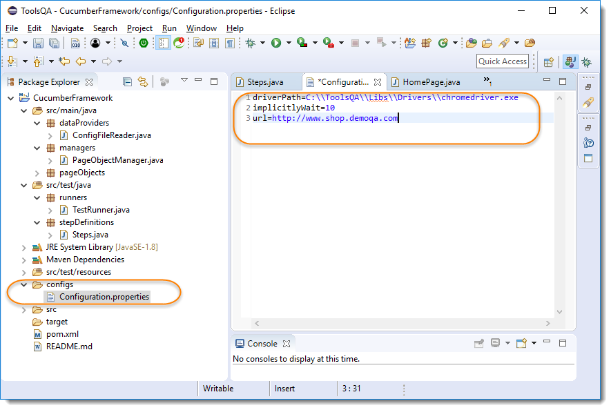 Note: The above is the properties file that we will use for the Cucumber tests. Remember white space between the property name and property value is always ignored.