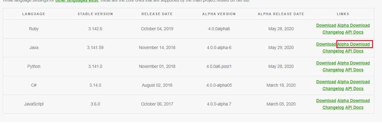 Note: As the Selenium 4 Alpha has already launched, there is an explicit link in the last column to download the Selenium 4 Alpha binding. Consequently, to download the Alpha version, you need to click on the link highlighted in the screenshot below: