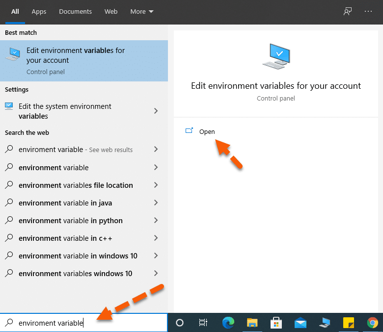 First, we need to open the Environment Variable pop-up. To do that, click on the search bar and search for "Environment Variables". It will search and display "Edit environment variables for your account", as shown in the image below. After that, click on the "Open" to open the System Properties pop-up.