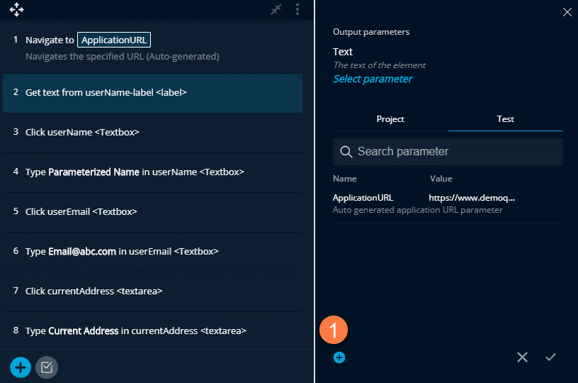 - Navigate to the test and click on the test step with get text action. A panel will open, scrolling down a little will show Output Parameter section as displayed in the image below.